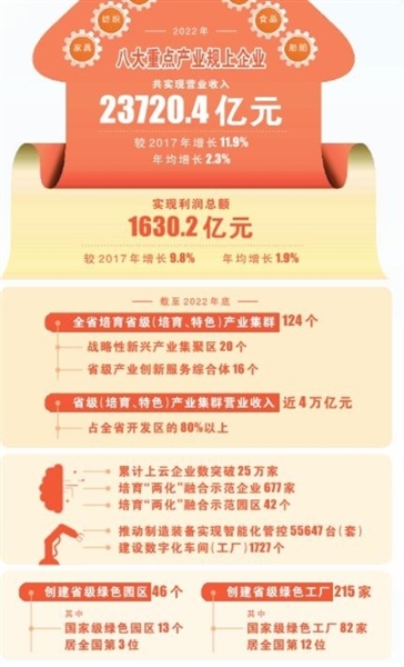 全省上下紧紧围绕打造全国传统产业转型升级高地,大力推动企业智能化改造、服务型制造、数字化转型、绿色化提升,再造传统产业竞争新优势。2022年,有色、石化、钢铁、建材、纺织、食品、家具、船舶八大重点产业规上企业共实现营业收入23720.4亿元,较2017年增长11.9%,年均增长2.3%;实现利润总额1630.2亿元,较2017年增长9.8%,年均增长1.9%。截至目前,全省累计培育国家技术创新示范企业13家、全国“质量标杆”8个;培育省级企业技术中心646家。全省累计调度推进4000个以上技改项目建设,安排财政资金2.68亿元支持188个技术改造项目;累计上云企业数突破25万家,培育“两化”融合示范企业677家,培育“两化”融合示范园区42个;推动制造装备实现智能化管控55647台(套),建设数字化车间(工厂)1727个;共创建省级绿色园区46个、绿色工厂215家,其中国家级绿色园区13个、居全国第3位,绿色工厂82家、居全国第12位。