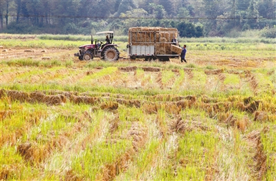 10月14日,靖安县仁首镇周口村农民驾驶农机在田间打捆装运稻草,用于生态肉牛养殖。近年来,靖安县补贴农机专业合作社农民采购稻草回收打捆机,免费将收割后留在田间的稻草打捆装运回收,用于发展生态肉牛养殖、食用菌等产业。特约通讯员 徐仲庭摄