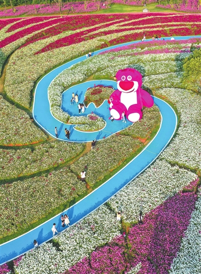 10月15日,在南昌县凤凰沟景区,数十亩格桑花绚丽绽放,吸引不少游客前来游玩。