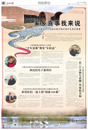 全国两会召开前夕,本报携手河北日报、南方日报、内蒙古日报、新华日报、黑龙江日报、广西日报推出“家乡喜事我来说”——沿着总书记的脚步看中国式现代化美好图景主题联动报道,深入采访2023年习近平总书记考察过的部分地方,传递群众心声,讲述家乡发展喜人成就,展示广大群众感恩奋进的精神风貌。完整报道请登录江西新闻客户端。