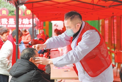 3月1日,在吉安市吉州区永叔街道光明社区,青年志愿者医疗服务队为社区居民开展听力、视力、口腔等项目的义诊服务,以实际行动传承雷锋精神。