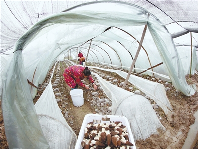 2月23日,村民在分宜县操场乡赤土村的羊肚菌种植基地采摘羊肚菌。 (特约通讯员 袁建兵 摄)