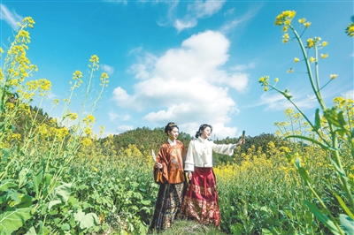 2月19日,游客在广昌县塘坊镇横山村百亩油菜花田里赏花拍照。 (特约通讯员 曾恒贵 摄)
