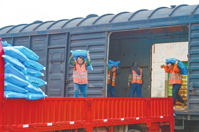 2月23日,在中国铁路南昌局集团有限公司赣州车务段赣州国际港站,工作人员在搬运化肥。(特约通讯员 胡江涛 摄)