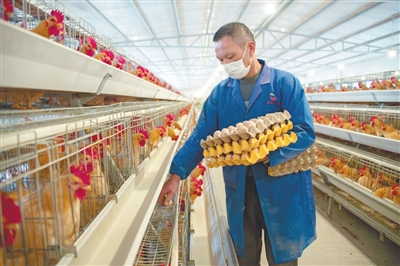 2月27日,定南县岭北镇天堂村民杰养殖基地,工人正在捡拾鸡蛋。(通讯员 钟 杰 摄)
