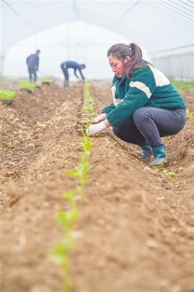 2月22日,奉新县赤岸镇历富村村民在蔬菜基地移栽辣椒苗。 (特约通讯员 周 亮 摄)