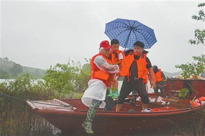 连日来,受持续强降雨影响,湖口县部分沿湖村庄出现内涝。当地党员干部闻“汛”而动,冲锋在前,全力保障人民群众生命财产安全。图为6月30日,该县舜德乡高桥村党员干部正在转移受灾村民,运送生活物资。 特约通讯员 张 玉摄
