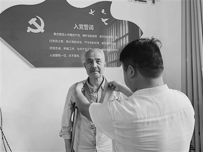 6月28日,萍乡市湘东区广寒寨乡郊溪村党支部向老党员谭俊辉颁发“光荣在党50年”纪念章,把党组织的关怀和温暖送到老党员心坎上。