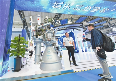 6月26日,在第八届中国—亚欧博览会上,参观者在中国航天科技集团有限公司展区了解YF-102系列发动机。6月26日至30日,第八届亚博会在新疆乌鲁木齐市举办。熠熠生辉的“大国重器”、自主研发的“智能建造”让人眼前一亮。新华社记者 王 菲摄