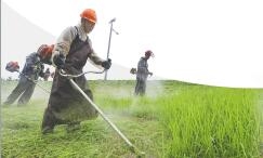 为保障堤坝安全度汛,6月28日,湖口县组织党员干部对沿湖沿江堤坝进行清杂除草作业。吴 江摄