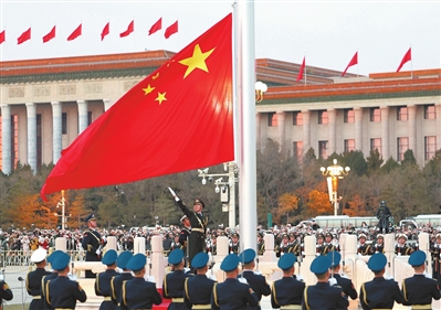 东方欲晓,晨曦微露。升旗号角划破长空,30名礼兵肃立两侧,96名国旗护卫队队员迈着坚定的步伐沿北京中轴线走来。