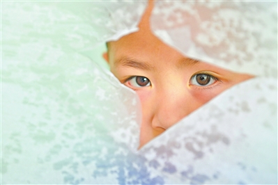 2024年4月10日,在抚州市第三医院儿童少年心理科个训室,一名孤独症患儿透过半透明纸的缝隙,向外张望。