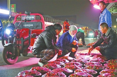 2024年1月14日凌晨,南昌深圳农产品中心批发市场人头攒动,络绎不绝的货车穿梭于肉类区、水果区、蔬菜区,呈现一派繁忙景象。