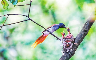2024年6月11日,南昌市红谷滩区的松山老树林中,一只寿带鸟妈妈正在给尚未离巢的雏鸟喂食。