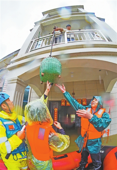 2024年6月26日,乐平市浯口镇程家墩村被洪水围困,当地党员干部及社会救援力量为村民送去生活物资。