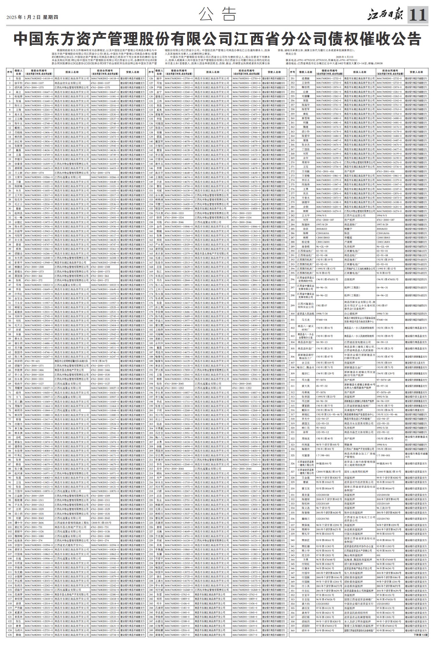 中国东方资产管理股份有限公司江西省分公司债权催收公告
