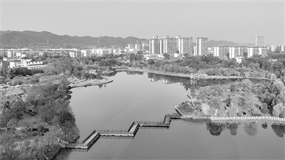 2024年12月31日,宜丰县新昌湖省级湿地公园,斑斓林木、清澈湖水、九曲浮桥、高耸楼宇相映成景,构成一幅冬日生态画卷。