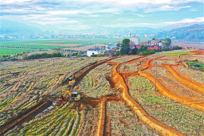 1月1日,萍乡市湘东区排上镇南村村,挖掘机往来穿梭,百亩高标准农田建设一派繁忙景象。目前湘东区高标准农田面积已达11万余亩。