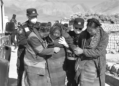 1月7日,救援人员在定日县扎村转移伤员。 新华社发