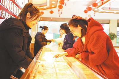 2月11日,顾客在浙江省德清县一家金店挑选黄金首饰。在2024年上涨超27%后,国内金价2025年继续攀升,频频刷新历史新高。2月10日,上海期货交易所上市的黄金期货主力合约收于每克679.08元,盘中一度触及每克679.5元,刷新历史新高。伦敦现货黄金价格10日盘中突破每盎司2900美元这一点位,而纽约黄金期货价格10日继续走强,盘中上攻至每盎司2930美元上方。新华社发 (倪立芳摄)