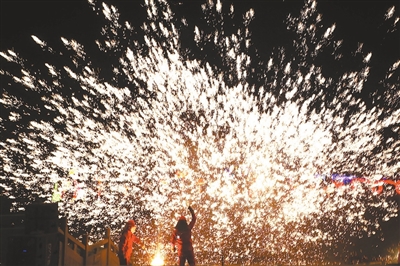 ② 2月10日晚,民间艺人在河南省焦作市温县陈家沟景区表演“打铁花”。