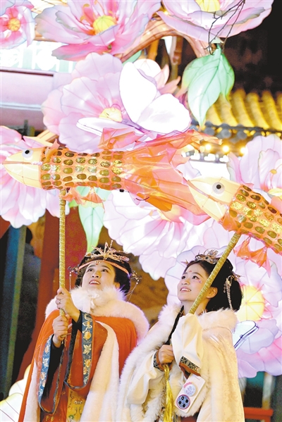 ③ 2月8日晚,身着传统服饰的游人在河北省石家庄市正定荣国府影视基地内游园赏花灯。新华社发 (陈其保摄)