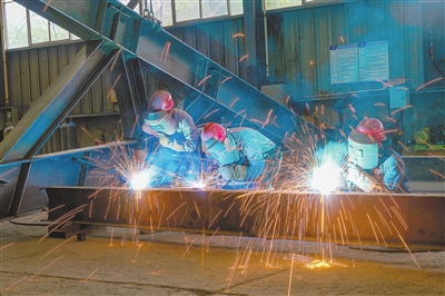 ▲2月11日,位于进贤县张公镇钢构产业基地的雄基钢构车间,焊花飞舞,工人正开足马力加工建筑构件。据了解,以钢构加工为代表的绿色建筑产业是进贤县特色优势产业,各企业正抢进度、赶订单,力争新春“开门红”。通讯员 樊哲平摄