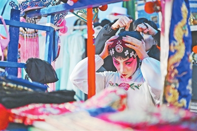 演员戴上符合角色的头饰,为登台演出精心准备。