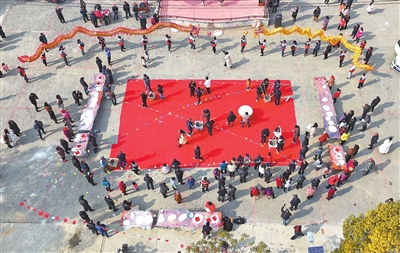 在新干县七琴镇东郭村打麻糍活动现场,村民手持杵杆高高举起、重重落下,浓浓的年味在人们心间蔓延。