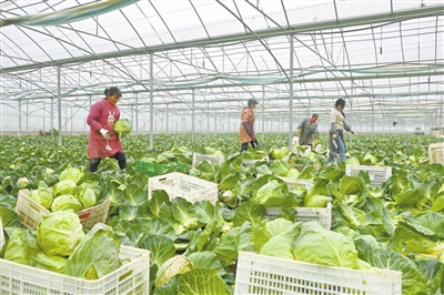 2月13日,金溪县秀谷镇丰收村设施果蔬基地,包菜喜获丰收,工人正忙着采收、装箱。 特约通讯员 邓兴东摄