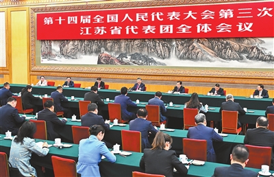 在听取大家发言后,习近平作了发言。他首先表示赞成政府工作报告,对江苏工作予以肯定,希望江苏落实好挑大梁的责任,努力取得新的更大成绩。