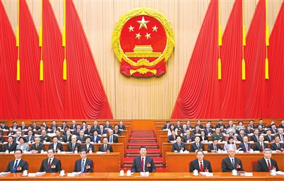人民大会堂大礼堂气氛庄重热烈,主席台帷幕正中的国徽与会场穹顶上的五角星灯交相辉映。