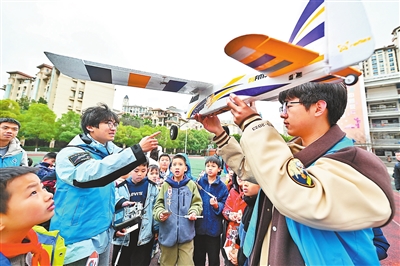 3月4日,南昌航空大学的志愿者来到南昌大学附属小学,通过航模飞行表演、航空知识科普等,为小学生们带来一场别开生面的志愿活动。图为大学生志愿者在给小学生介绍航模。