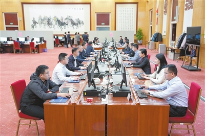 3月9日,十四届全国人大三次会议秘书处工作人员在认真工作。记者9日从十四届全国人大三次会议秘书处获悉,到大会主席团决定的代表提出议案截止时间3月8日12时,大会秘书处共收到代表提出的议案269件。此外,大会秘书处目前已收到代表建议8000余件。新华社记者 郑焕松摄