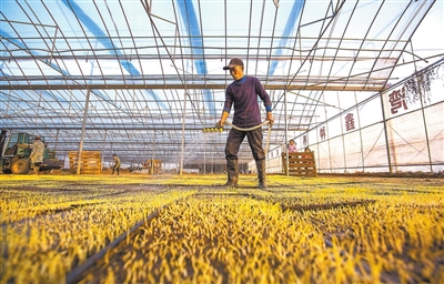 正值春耕备耕时节,都昌县大面积开展早稻集中育秧,为早稻机插打好基础。图为3月7日,蔡岭镇杨湾村工厂化育秧中心,农民在给早稻秧苗洒水。特约通讯员 傅建斌摄