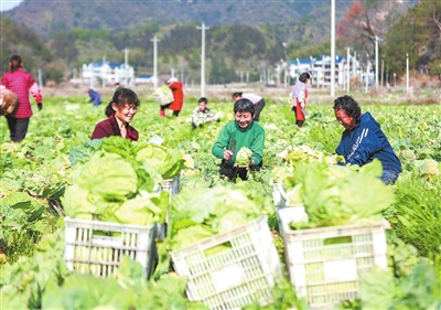 横峰县大力发展蔬菜产业,不断延伸产业链,带动群众在家门口增收致富。图为3月3日,青板乡徐村村菜农在采收、装运包菜。本报全媒体记者 赵 影摄