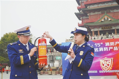 3月8日,南昌市在滕王阁前集中销毁假冒伪劣消防产品百余件。图为消防人员在集中销毁现场向群众讲解辨别假冒伪劣消防产品知识。