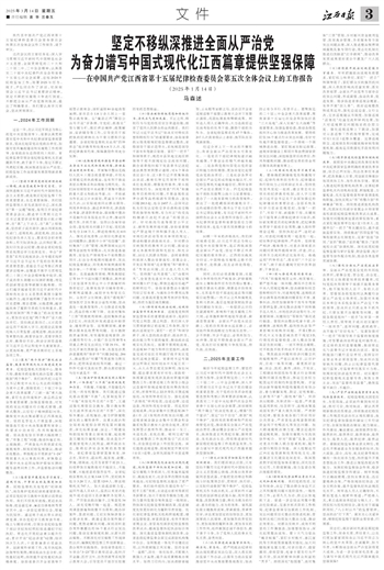 (二)聚焦“两个维护”强化政治监督,服务保障现代化江西建设更加有力。纪检监察机关围绕中心、服务大局,最根本的是强化政治监督,督促做到“两个维护”。我们始终把习近平总书记和党中央关心关注的问题作为重中之重,围绕党的二十届三中全会重大改革部署、“三新一高”重大战略,紧盯生态环境保护、食品药品安全等重要部署,加强监督检查,对发现的突出问题实行台账式管理、清单式整改,以钉钉子精神跟踪问效,确保党中央决策部署在江西落地见效。坚持见事见人开展监督,深挖细查落实党中央决策部署和省委工作要求中的责任、作风和腐败问题。坚决查处盲目举债大搞政绩工程、“形象工程”问题,推动纠偏正向、止损挽损。严肃查处自然资源系统腐败案件,制发纪检监察建议,推动系统整治。积极配合开展新余“1·24”特别重大火灾事故问责,审慎稳妥开展中央生态环境保护督察反馈问题等追责问责工作,并监督推动问题整改。
