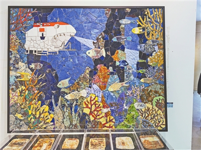 来自景德镇陶瓷大学的瓷板画作品《海底之光》,以中国载人潜水艇“蛟龙”号为灵感和主题,通过“蛟龙”号展现中国的科技赋能,凸显其突破7000米深海的壮举。画家用彩色瓷块拼贴出的瑰丽海底景象,传递出对海底秘境的探索与追寻。