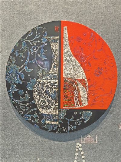 来自江西科技师范大学的漆画作品《碧海丝路》,整体风格以古代丝绸之路为历史背景,展现了当代艺术家对文化交流与和谐共生的理解与诠释。作品既有传统漆画语言,又融入现代审美元素,具有时代感、装饰性和观赏性。
