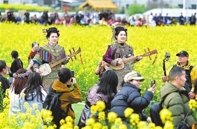 3月16日,在贵州省榕江县车江大坝,村民们穿着民族盛装参加花田走秀。当日,在贵州省黔东南苗族侗族自治州榕江县车江大坝,一场以“村秀·秀未来”为主题的民族服装秀在花田间举行。 新华社记者 杨文斌摄