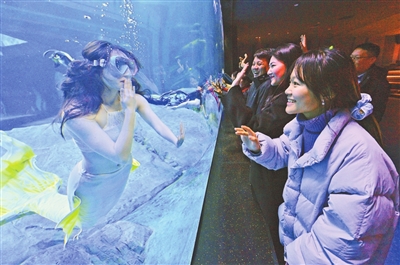 游客隔着玻璃与“美人鱼”演员互动。
