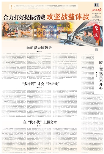 消费一头连着千行百业,一头连着千家万户,事关经济社会发展全局。今年国务院政府工作报告32次提到“消费”,其中,扩内需位列今年工作任务之首。此前,我省召开的全省提振消费大会也提出要以精准务实举措推进提振消费专项行动。如何看待此次提振消费的意义?如何把握消费能力、消费供给、消费环境等对打好这场攻坚战整体战的影响?聚焦这些问题,今日本版推出4篇言论,请读者留意。