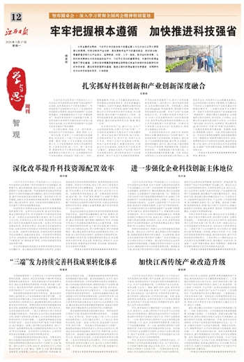 今年全国两会期间,习近平总书记在参加十四届全国人大三次会议江苏代表团审议时强调,科技创新和产业创新,是发展新质生产力的基本路径。抓科技创新,要着眼建设现代化产业体系,坚持教育、科技、人才一起抓,既多出科技成果,又把科技成果转化为实实在在的生产力。习近平总书记的重要讲话,为建设科技强省提供了根本遵循。江西日报传媒集团智库事业部特邀江西省科学院科技战略研究所的专家学者,围绕牢牢把握根本遵循、推进江西科技强省建设发表建言。本期特刊发与会专家学者的观点,以飨读者。