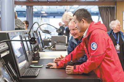 3月18日,在停靠新西兰克赖斯特彻奇市利特尔顿港的“雪龙2”号上,工作人员向参观者展示驾驶台。