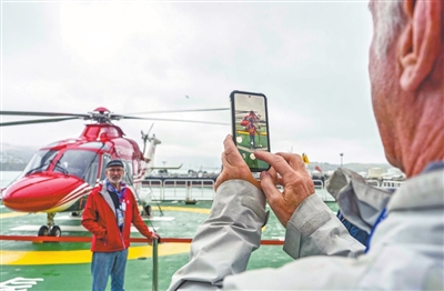 3月18日,在停靠新西兰克赖斯特彻奇市利特尔顿港的“雪龙2”号上,参观者与直升机合影。