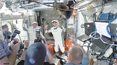 这张视频截图显示了3月17日,美国宇航员威尔莫尔和威廉姆斯(中右)在启程返回地球前挥手致意。美国太空探索技术公司“龙”飞船搭载包括因“星际客机”飞船故障滞留国际空间站的美国宇航员威尔莫尔和威廉姆斯在内的4名宇航员,于美国东部时间18日凌晨脱离国际空间站,启程返回地球。