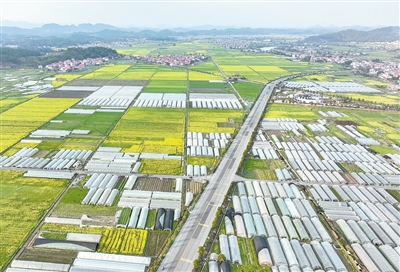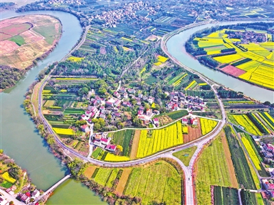 3月16日,芦溪县银河镇河下村一带,宽阔的乡村公路与青山、河流、民居、油菜花海、果蔬产业基地等交相辉映,蔚为壮观。