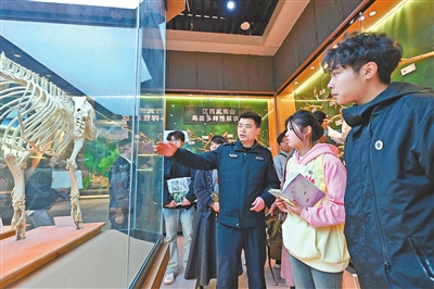 3月19日,在武夷山国家公园江西片区宣教馆内,郭洪兴向上饶职业技术学院的学生介绍动物标本。