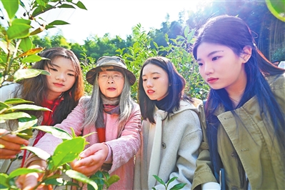 3月19日,中国林学会自然教育师曾素萍(左二)向上饶职业技术学院的师生们科普茶叶生境及茶树特征。